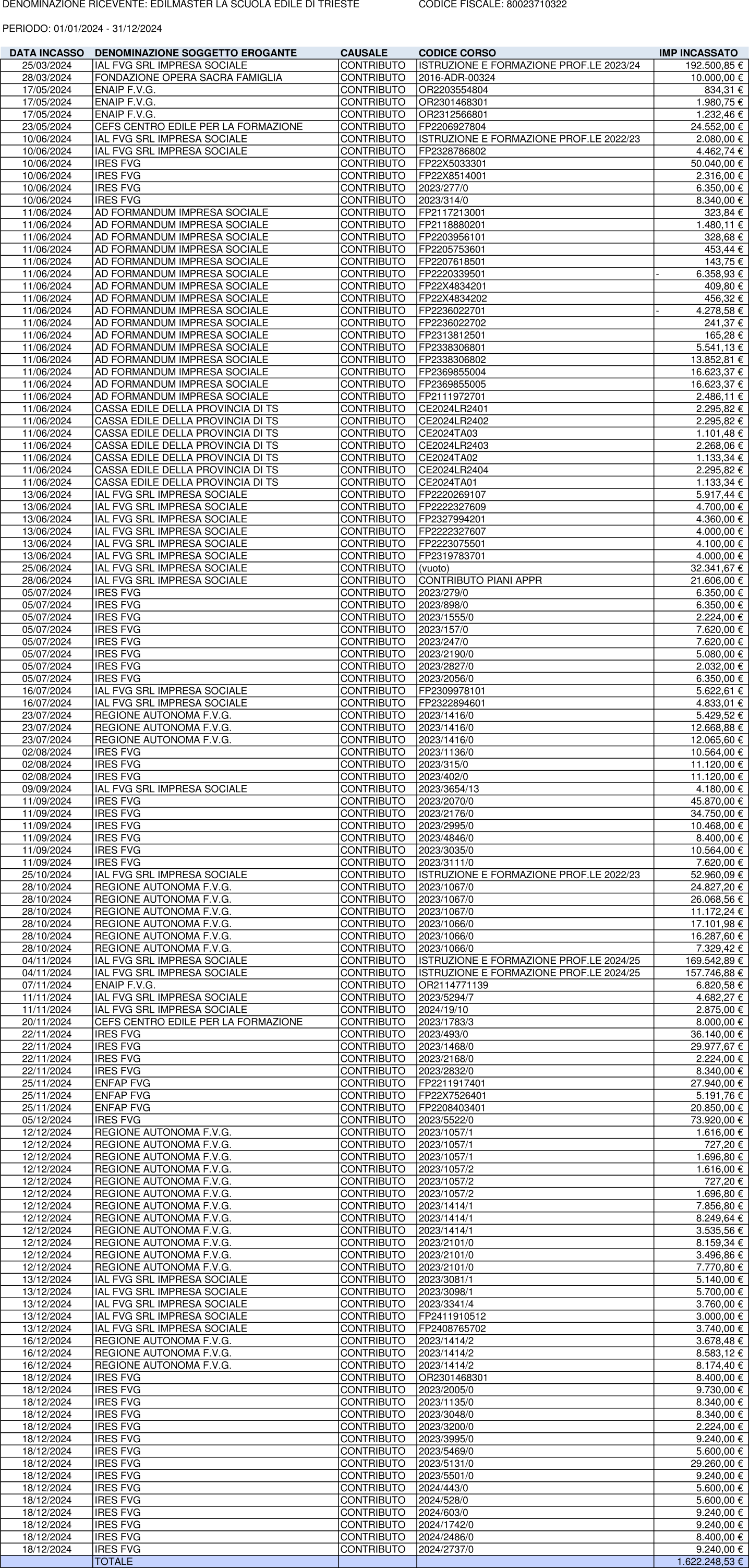 dettaglio dei Contributi Pubblici incassati dal 01/01/2024 al 31/12/2024